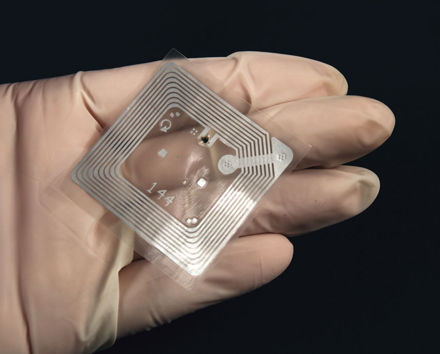 تتكون رقاقة الـ RFID أساساً من هوائي لاقط للموجات الكهرومغناطيسية، وشريحة ذاكرة تخزّن عليها معلومات لا تتجاوز 512 حرفاً رقمياً Bit، وكل هذه المكونات مطبوعة على رقاقة صغيرة بفضل التقدم الكبير في مجال الدوائر المتكاملة.