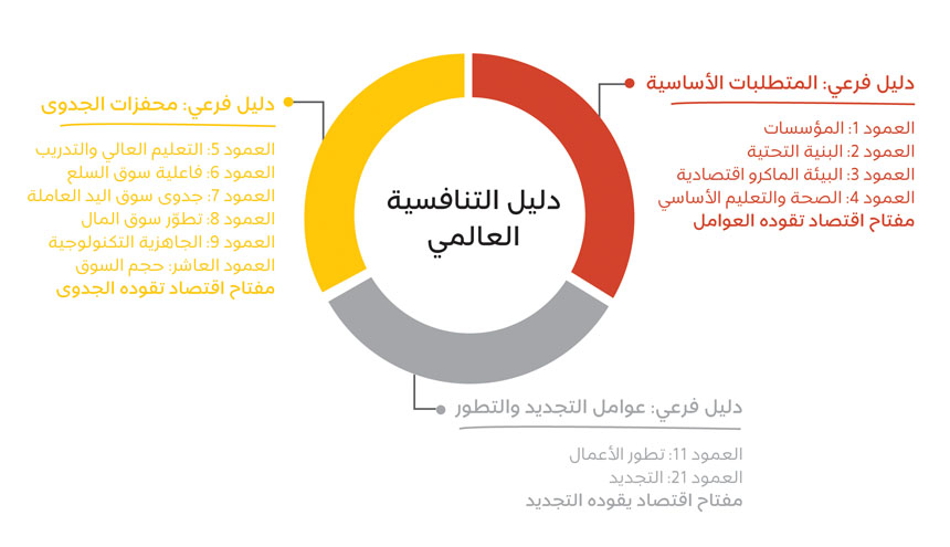 لقد حدّد دليل التنافسية العالمي (Global Competitiveness Index GCI) هذا الأفق المفتوح باحتوائه معدّلاً مدروساً لمختلف العوامل، التي يقيس كل منها مظهراً مختلفاً من التنافسية. هذه العوامل مجموعة في أعمدة التنافسية الاثني عشر: