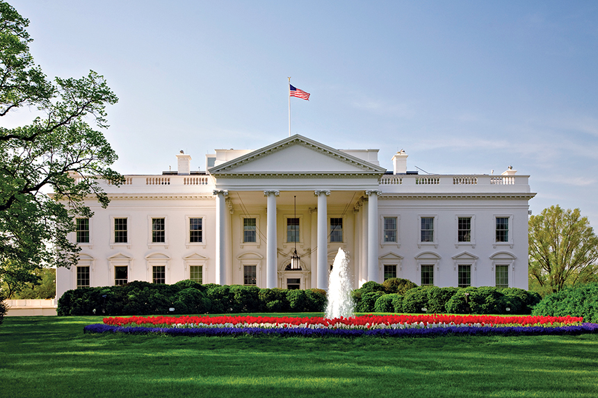 ربما يكون البيت الأكثر شهرة في العالم، فهو مقر الإقامة والرئاسة لرئيس الولايات المتحدة الأمريكية، وهو المقر الرسمي والمركزي لأعلى سلطة تنفيذية في الولايات المتحدة الأمريكية، كما يمكن وصفه موضوعياً، ولكنه الآن مركز قيادة العالم على ما يصفه مناهضوه أو مساندوه.يقع في العنوان المعروف بواشنطن دي سي، مقاطعة كولومبيا، 1600 شارع بنسلفانيا، ويُعد أشهر القصور الرئاسية في العالم.بينما كان يتم تطوير العاصمة واشنطن عقدت مسابقة لاختيار مهندس لتصميم البيت الأبيض، ولقد فاز بها المهندس جيمس هوبن. بُدئ العمل فيه في عام 1792م حيث أُحضرت الأحجار من أسكتلندا، وأشرف على بنائه الرئيس جورج واشنطن.يقع البيت الأبيض على قطعة أرض مساحتها 7.3 هكتار، ويتكوَّن أساساً من الحدائق ومجمع البيت الأبيض الذي يتكوَّن بدوره من المقر الرئيس والجناح الشرقي والجناح الغربي.