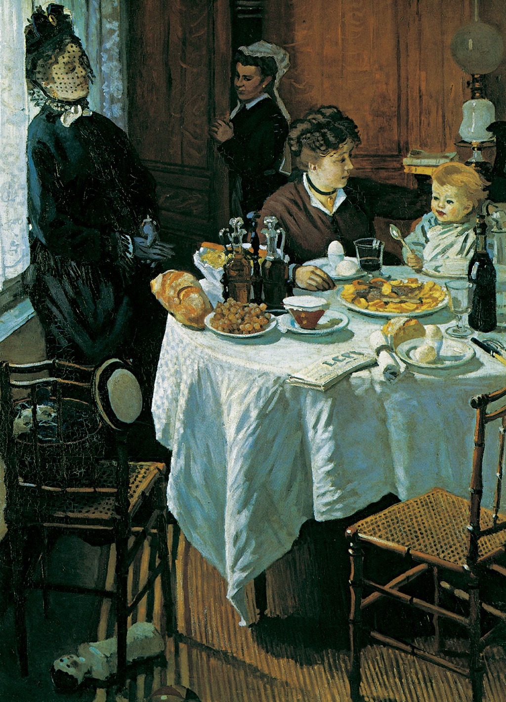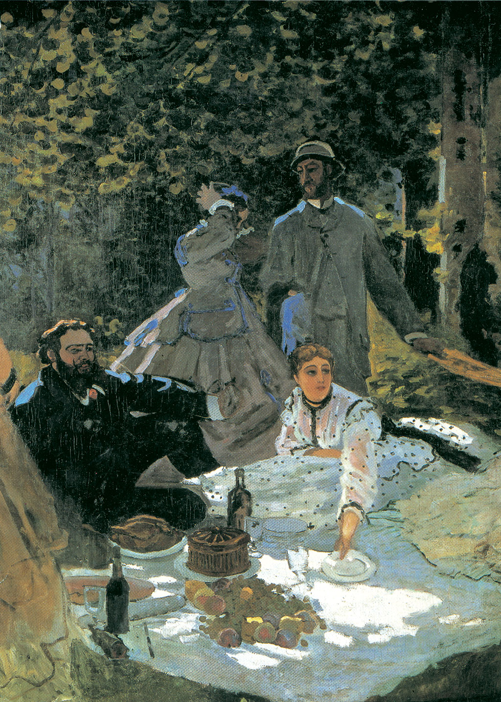 “الغداء على العشب” ليس عنوان اللوحة التي رسمها إدوار مانيه فقط، فبعده بسنتين رسم كلود مونيه لوحة بالعنوان نفسه. وفي كل واحدة من هاتين اللوحتين، نرى أربعة أشخاص يتناولون الغداء في البريّة، ولكن في حين أننا لا نرى من الطعام في اللوحة الأولى سوى سلّة فاكهة ورغيف خبز، نرى في الثانية دجاجة محشوة وقالب حلوى بالشوكولاته، إضافة إلى الخبز والفاكهة والأطباق.. والكل مرتب على غطاء أبيض فرش أرضاً. أمّا الأشخاص الأربعة فيقعون خلفه وكأن المائدة بحد ذاتها هي الموضوع الرئيس. ولكن بسرعة تحوّل تركيز الرسّامين من الغداء على العشب في الطبيعة إلى ما هو معاش يومياً في مدينة تخنقها المقاهي وصالات الموسيقى وأصوات الصحون في سمفونية آدميّة وجد الانطباعيّون متعة في الاستماع إليها وتسجيل تفاصيلها.