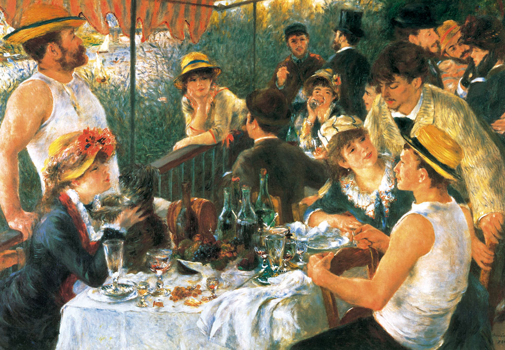 غير أن أهم لوحات الانطباعيين في هذا المجال كانت تلك التي صوّرت حالات الفرح الاجتماعية من خلال بهجة الأجواء في المطاعم والمقاهي وحول الموائد. ولعل رينوار هو الأبرز في هذا المجال، ففي لوحة “حفلة راقصة في مقهى مولان دي لا غاليت” رسم الفرح الصاخب بعطلة يوم الأحد واللقاء في أحد المطاعم، ومن بين الحشود الظاهرة في اللوحة يستطيع المدقق في الوجوه أن يكتشف أن من بين هؤلاء يوجد العديد من الفنانين أصدقاء الرسّام.