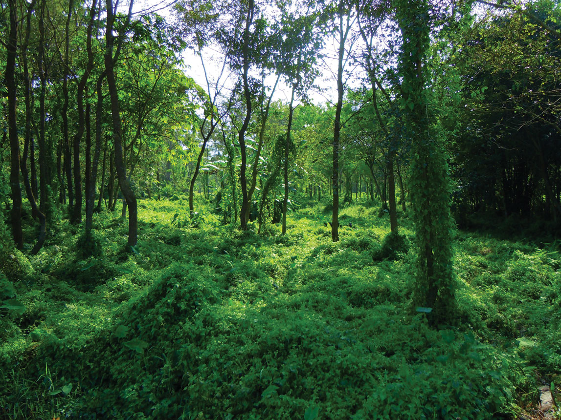 DSCN8680خلال الحرب العالمية الثانية نقل الإنجليز نبتة متسلقة برِّية من المكسيك وزرعوها في غابات شمال الهند، لاستخدامها في تمويه الآليات والمواقع العسكرية، لأن لا فائدة أخرى لهذه النبتة. ولكن ما حصل بعد ذلك هو أن البيئة الآسيوية كانت ملائمة جداً لهذه النبتة، وأكثر بكثير من موطنها الأصلي في المكسيك. فراحت تتكاثر بسرعة مدهشة. ولما انتبه القيِّمون على الغابات إلى أنها تقضي تماماً على الأشجار التي تتسلقها، كان الأوان قد فات على استئصالها، فاستمر انتشارها من الهند إلى النيبال وبوتان والصين حيث قضت ولا تزال تقضي على ملايين الأشجار البرية سنوياً. ومنذ سنوات عديدة تنصبّ جهود العلماء البيئيين على اكتشاف وسيلة تسمح لهم بالقضاء على هذه النبتة، ولكن دون جدوى حتى الآن.