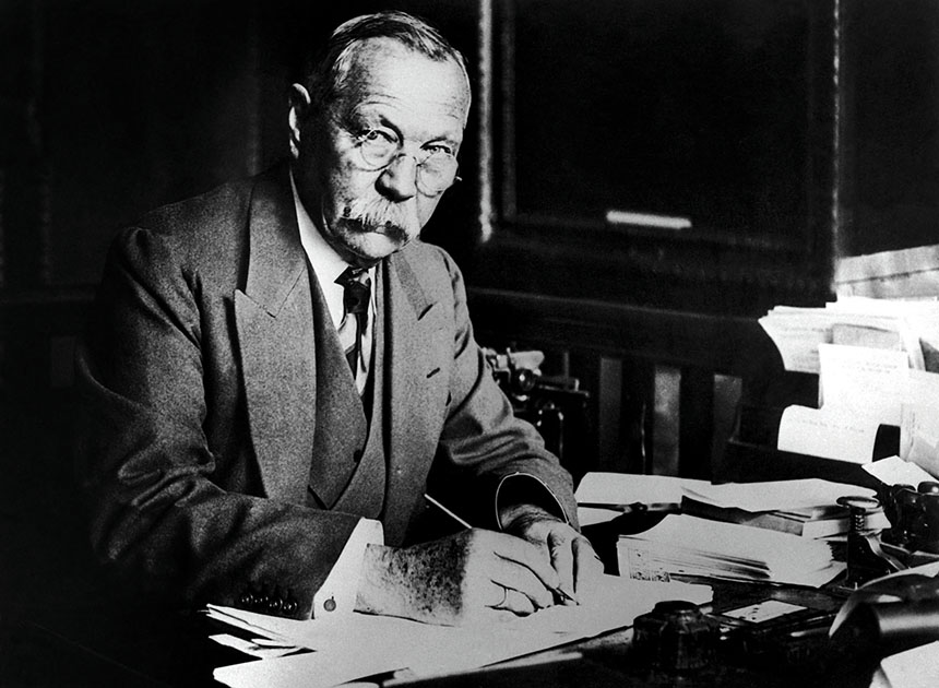 SIR ARTHUR CONAN DOYLE A SON BUREAU EN 1923ثمة عبارة شهيرة للأديب الروسي الكبير دوستويفسكي ينسب فيها الريادة بين الأدباء الروس إلى نيكولاي غوغول صاحب رواية «المعطف»، يقول فيها «لقد خرجنا جميعاً من معطف غوغول». وإذا كان لمعطف غوغول هذا الأثر الكبير على الأدباء الروس الذين أبهرونا بروائعهم الخالدة، فإن ثمة معطفاً آخر كان له أثرٌ بالغ كذلك على كتَّاب من مختلف الجنسيات والثقافات أدهشونا منذ القِدم بنمط كتابتهم المختلف وما زالوا يفعلون حتى اليوم.
