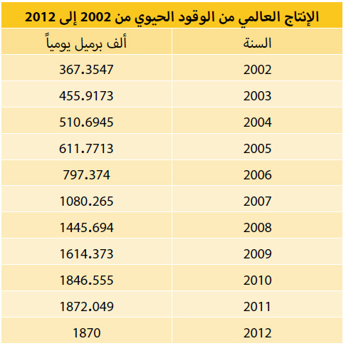 ينتج العالم حوالي 1.87 مليون برميل من الوقود الحيوي يومياً، وهي تعادل حوالي 1.21 مليون برميل يومياً من الوقود النفطي المكافئ، لأن برميل الوقود الحيوي يحتوي فقط على ثلثي كمية الطاقة الموجودة في برميل النفط. وتستهلك جل الكمية المنتجة في مجال المواصلات وبالأخص السيارات والشاحنات. وتمت مؤخراً تجربة أنواع متطورة منه لتُمزج بوقود الطائرات.