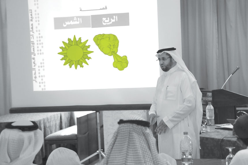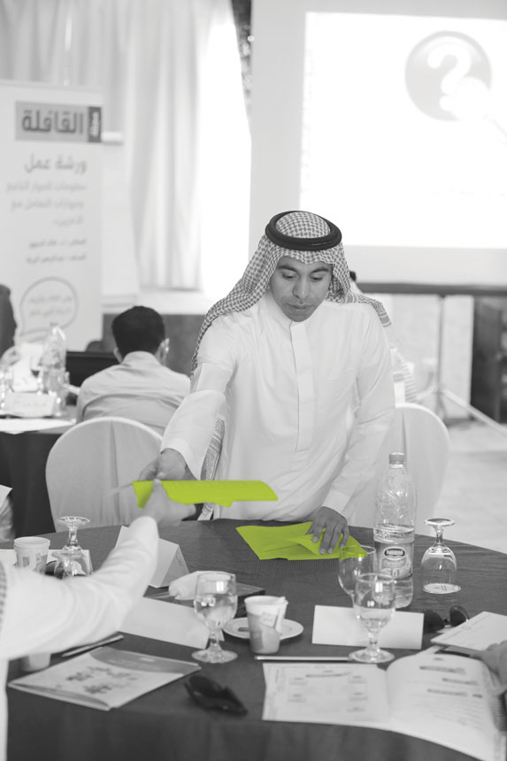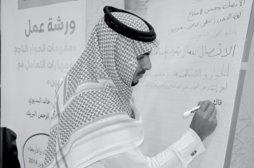 ZAKI7746-bwالحوار فعل أخطر مما يبدو على ممارستنا التلقائية له. ولأنه مفترق الطريق إلى النجاح أو الفشل، كانت ورشة عمل «القافلة» هذه المرة بعنوان «مقوّمات الحوار الناجح ومهارات التعامل مع الآخرين»، التي أدارها الدكتور خالد البديوي في فندق كارلتون المعيبد في الخبر، بحضور عدد من المشاركين من خبراء ومهتمّين بتطوير مهاراتهم في هذا المجال.