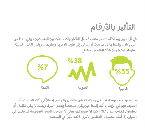ثمة مفهوم سائد بأن معظم التأثير يأتي من مضمون الكلام. ولكن ما لا يعرفه الناس أن دراسة علمية شهيرة كشفت أن الكلمات لا تؤثر إلا بنسبة لا تتجاوز %7 فقط في الآخرين. أما لغة الجسد فتؤثر في الآخرين بنسبة %55، فيما ينال الصوت نسبة تصل إلى %38. وهو ما يعني أن التأثير يخضع لعدة عوامل ولا يعتمد فقط على الكلام. فالمتلقي لا يكون مركزاً فقط على ما يقال بل يستخدم بقية حواسه لاستكمال انطباعه ورأيه، فطريقة اللبس وحركات الجسم كلها مؤثرة ولن تكون معزولة في الحكم على المتحدث بالمجمل.