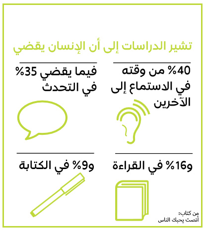 قلائل منا يعرفون أن الإنسان يقضي %40 من حياته في الإنصات! وهذا ما يستدعي وجوب تطوير فن الإنصات كمهارة قائمة بحد ذاتها، لاستفادة أفضل من كل هذا الوقت الطويل، بدلاً من أن يضيع إنصاتنا سدى بسبب عدم التركيز لحساب أمور أقل أهمية.