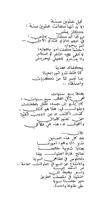 فيما بعد، كنا نفتتح الألفية الثالثة سوياً في ملتقى شعري كان يقام كل شهر تقريباً في نادي جدة الأدبي. كان كل شيء يتساقط في ذلك الزمن: النظريات والأوهام والأقنعة والملاحق والقناعات والأندية الأدبية.. وحتى الكثير من الأصدقاء، أولئك الذين كنا نظن الحياة لا تطاق من دونهم.