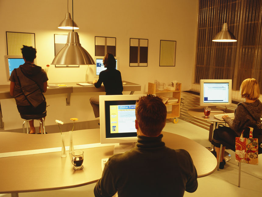 أخيراً، وبنتيجة طبيعية لموجة العمّال الرّحل وحاجاتهم، ظهرت مقاهٍ من نوع آخر. مقاهٍ، إن جاز لنا تسميتها بذلك، تتخصص في تقديم الخدمات المكتبية لكل من يمتهن العمل المستقل أو الحر، وليس لديه مكتبٌ يأويه. هذه المقاهي، أو كما يسميها الأمريكان «مساحات العمل المشتركةCoworking Spaces / » عبارة عن مساحات تشبه مساحات المقاهي المعتادة، ولكن بدلاً من الطاولات التي تحيط بها الكراسي، والتركيز على الطعام والمشروبات كخدمة أساسية، تقدِّم مكاتب مصغرة لكل شخص، وقد تفصل بينها فواصل لخصوصية محدودة. يستطيع العمّال الرّحل عادةً استئجار مثل هذه المكاتب بصيغ مختلفة، منها الإيجار بالساعة، أو باليوم، بالشهر أو حتى بالسنة. ساعات العمل تختلف من مكانٍ إلى آخر، ولكن العادة جرت أن أصحاب مثل هذه المنشآت، ومنهم من قام عليها ليحل مشكلته الشخصية في العمل الحر، يعلمون جيداً طبيعة توزيع العمل لدى عملائهم، ويدركون أن أوقاتهم ليست محدودة بالساعات ما بين التاسعة صباحاً والخامسة عصراً. «جريند» مثلاً، وهو مساحة عمل مشتركة في نيويورك، يعلن عبر موقعه أنه مفتوح حتى الساعة الثانية عشرة ليلاً، ولكن إن أردتَ (الكلام موجّه للعميل) يمكنك أن تقضي فيه وقتك حتى بعد منتصف الليل.