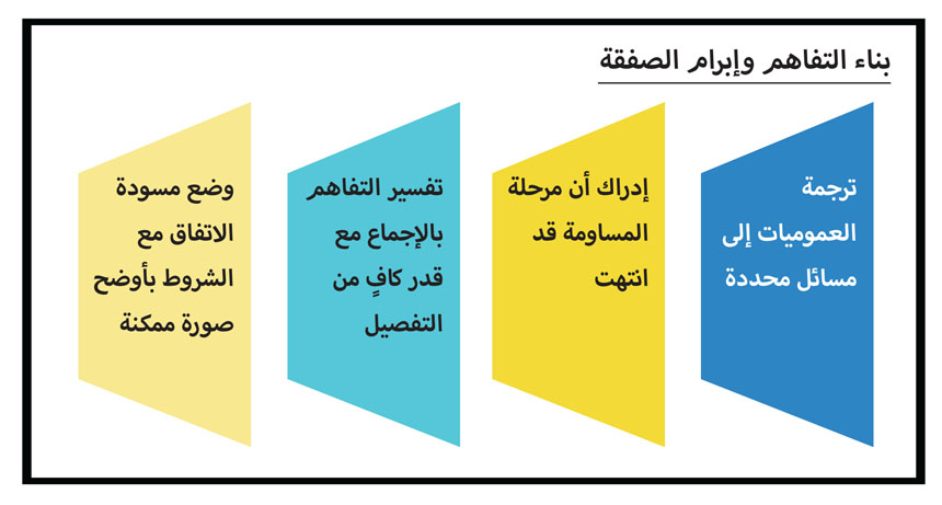 المرحلة الثالثة من عملية التفاوض هي وقت التوصل إلى تفاهم ووضع صيغة الاتفاق. تتطلب هذه المرحلة قدراً من العمل الجاد من أجل ضمان توصل المفاوضات إلى النتائج المرجوة.