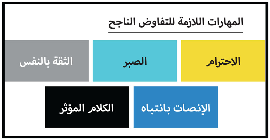 ويجب في كل واحدة من المراحل الثلاث ممارسة أكبر قدر ممكن من مهارات التفاوض الخمس التالية: 1) إجادة التحدث 2) إجادة الاستماع 3) إبداء الثقة بالنفس 4) التحلي بالصبر 5) احترام الطرف الآخر.