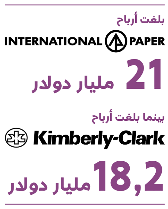 وثمة شركتان تحلان في المرتبتين الأولى والثانية في إنتاج الورق في العالم، وهما: “إنترناشونال بيبر”، و”كمبرلي- كلارك”، وكلاهما من الولايات المتحدة. وقد ربحت صناعة الورق الأمريكية نحو 96,1 مليار دولار أمريكي عام 2015م. وفي عام 2016م، ربحت “إنترناشونال بيبر” وحدها أكثر من 21 مليار دولار، فيما ربحت “كمبرلي- كلارك” نحو 18,2 مليار. ومن الشركات الكبرى الأخرى في هذه الصناعة شركة مقرّها إندونيسيا، هي “آسيا بَلب أند بيبر”، والشركة السويدية “سفنسكا سللولوزا”، والشركة الفنلندية “ستورا إنسو أند أو بي إم كيميني”، والشركة اليابانية “مجموعة نيبون بيبر”.