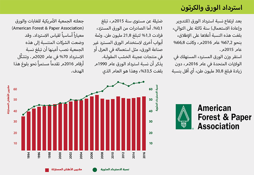 والورق من المصادر القابلة لما يسمّى الاسترداد، أي عدم إلقائه في النفايات من أجل إعادة استعماله بواسطة التدوير، بل إنه من المواد التي تتميَّز بنسبة عالية جداً من قابلية الاسترداد. ففي عام 2013م، تمكَّنت مختلف بلدان العالم من استرداد وجمع نحو 233 مليون طن. وفي الولايات المتحدة وحدها، استُرِدت أكثر من 47 مليون طن من الورق والكرتون، ومثل هذا المقدار يُسترَد كل عام في الولايات المتحدة. وقد بلغت نسبة الورق الأمريكي المسترد عام 2015م، %66,8، أي أكثر من ضعف نسبة الاسترداد في عام 1990م، التي بلغت أقل من %34.