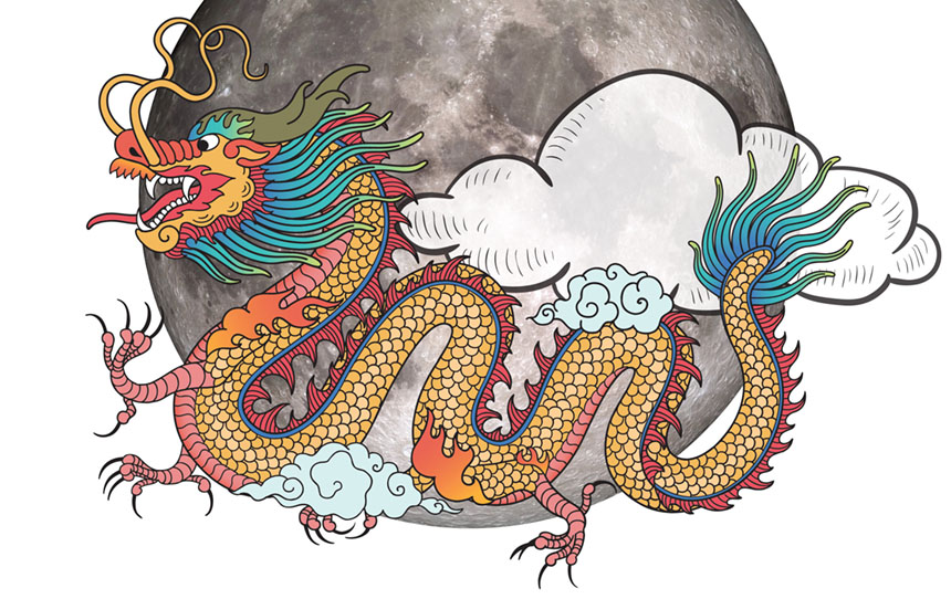 تقوم فلسفة الـ (ين – يانغ) الصينية، أو الطاوية، على نظرية العناصر الخمسة: الخشب والنار والأرض والمعدن والماء. ومن هذه العناصر الخمسة، مجتمعة أو منفردة، تقوم كل موجودات الطبيعة، وهي أساس النجمة الصينية المؤلفة من القمر والغيمة والتنين، المرتبطة بعضها ببعض، حيث أصبحت أيقونات ثقافية تكررت صورها في الأعمال الفنية التقليدية، والعملات الصينية القديمة منذ أكثر من ألفي سنة، فالغيمة التي تنشأ بين السماء والأرض، هي منبع الماء الذي يغذي الحياة، ورمز للعالم السماوي، مثلما تحمل معنى الحركة أيضاً، لأن الخالدين، كما تصورهم الأساطير الصينية، كانوا يستخدمون السحب بمنزلة عربات للتنقل والسفر.