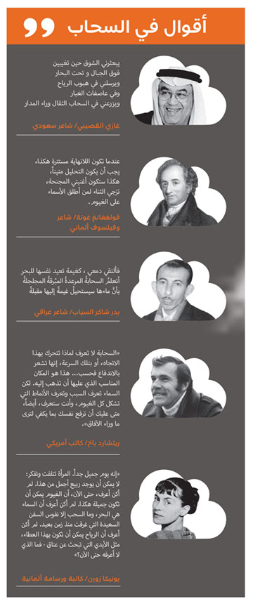 للغيوم مكانة خاصة بين كل عناصر الطبيعة، وذلك لألف سبب وسبب. فهي من أقدمها في تشكيل ملامح كوكبنا الأرضي. وكل قطرة ماء، سواء أكانت في أجسامنا ودموعنا أم في مجاري الأنهار والينابيع أم في البحار، كانت ذات يوم «غيمة»، وسيأتي يوم تعود فيه مؤقتاً غيمة قبل أن تصبح ماءً من جديد. إنها حلقة لا بد من أن يمر بها أهم عنصر للحياة. ولذا، كان الإنسان منذ أن خُلق على هذه الأرض، يتطلع إلى الأعلى، صوب السماء، ليستطلع في غيومها ما ستكون عليه أحواله تحتها. فما بينه وبين الغيوم التي تظهر وتختفي، علاقة تجاوزت أبعادها المادية، لتتجلى حضوراً صارخاً في الآداب والفنون وكافة مجالات التعبير عن الوجدان الإنساني.