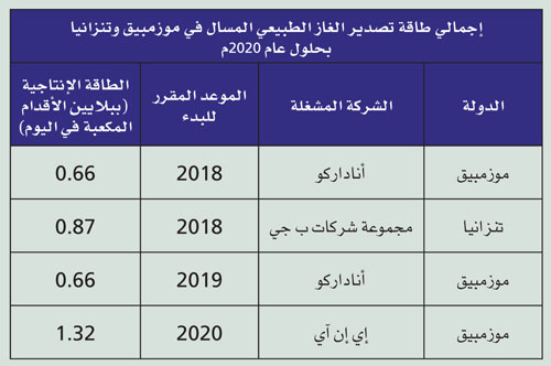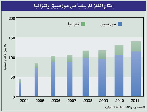يبلغ إجمالي احتياطات الغاز المثبتة القابلة للاستغلال 4500 بليون قدم مكعبة في موزمبيق، و230 بليون قدم مكعبة في تنزانيا. تشير بعض التقديرات المتفائلة في تحقيق درجة من النجاح في تطوير هذه الاحتياطات إلى مستوى إنتاج غاز يبلغ 9 بلايين قدم مكعبة في اليوم في عام 2035م من كلتا الدولتين، أي ما يمثل %50 من النمو المتوقع في إنتاج القارة الإفريقية للغاز خلال هذه الفترة.