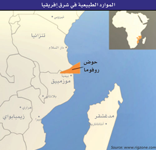 وبالنسبة لحوض روفوما الذي يمتد عبر أراضي تنزانيا وموزمبيق، فقد تم تقسيم الجزء التابع لموزمبيق إلى ست مناطق تنقيب تمت ترسية كل منها بموجب عقد امتياز منفصل، حيث مُنح ترخيص المنطقة الأولى إلى شركة أناداركو الأمريكية، والمنطقتين الثانية والخامسة إلى ستات أويل النرويجية، والمنطقتين الثالثة والسادسة إلى بتروناس الماليزية، والمنطقة الرابعة إلى «إي إن آي» الإيطالية. في شهر يونيو من عام 2012م، وبعد حفر عديد من الآبار التقييمية الناجحة في المنطقة الأولى، صرَّحت شركة أناداركو عن اكتشاف 30 تريليون قدم مكعبة من موارد الغاز القابلة للاستخراج. وفي شهر ديسمبر من عام 2012م، أعلنت شركة «إي إن آي» موارد غاز تبلغ 75 تريليون قدم مكعبة في المنطقة الرابعة. ومع استمرار الاستكشافات في نفس المنطقة، أضافت الشركة مؤخراً في شهر سبتمبر من هذا العام 10 تريليونات قدم مكعبة.