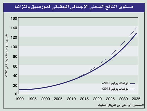 وهنا تَبْرُز قيمة اكتشافات الغاز في هذا الوقت الحرج وفي ظل هذه الظروف الاقتصادية المتدهورة، مما يبشر شرق إفريقيا بإمكانات كامنة تستطيع أن تحولها إلى منطقة ناهضة في مجال الطاقة على الصعيد العالمي. وفي موزمبيق، هناك توقعات متفائلة بأن ترتفع وتيرة نمو الناتج المحلي الإجمالي على المدى المتوسط بعد أن أصدر البنك الدولي مؤخراً تعديلاً تصاعدياً في التوقعات الاقتصادية لموزمبيق، حيث يتوقع زيادة سريعة تبلغ %9.29 في إجمالي الناتج المحلي سنويًا خلال الفترة من 2013 إلى 2017م. وفي شهر يوليو 2013م، قدَّمت شركة «آي إتش إس قلوبال إنسايت» تعديلاً متفائلاً لتقريرها عن إجمالي الناتج المحلي المستقبلي الذي صدر في يوليو 2012م قبل أن تتبلور اكتشافات الغاز بصورة كاملة. وتشير هذه التوقعات إلى أن استغلال اكتشافات الغاز الجديدة سترفع من إجمالي الناتج المحلي لكلتا الدولتين بنحو 140 بليون دولار خلال الفترة من 2018 إلى 2035م بمعدل %6.2 سنوياً في المتوسط. وحتى في ظل العجز المالي الذي يتوقعه صندوق النقد الدولي، ستؤدي صادرات الغاز إلى معادلة الحسابات الجارية مع حلول عام 2020م.
