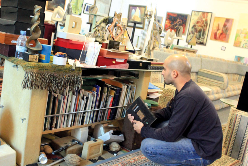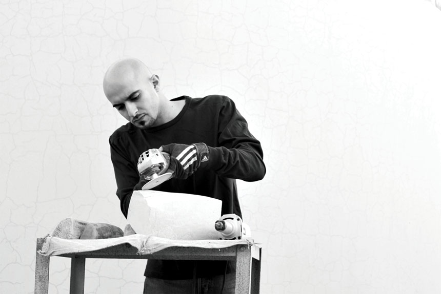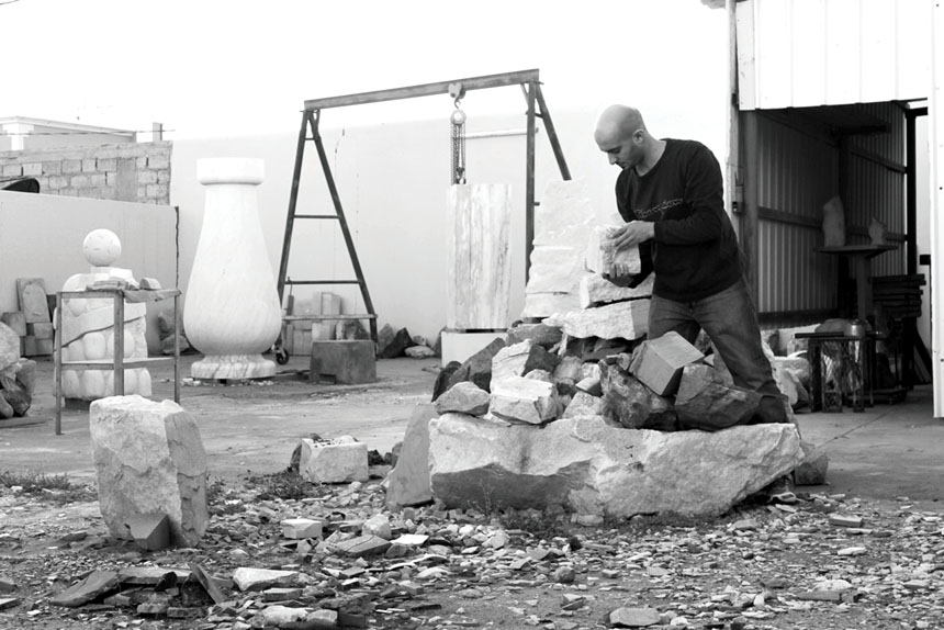 وعلى الرغم من كونه يحب أدواته، ويعاملها بكثير من الاهتمام، وربما يتعكر مزاجه لأيام إذا ما قام أحد بلمس هذه الأدوات أو تغيير مكانها، فإنه لا يمانع أن يزدحم محترفه بعشرات الأشخاص وهو يعمل. فقد اعتاد ذلك عند عمله الحي في المهرجانات وورش العمل. أما السبب الآخر الذي يجعله مرتاحاً على الرغم من حساسية حالة التكوين الفني التي يكون فيها، فهو أن النحت حالة عزلة كما يقول. فالأدوات الخطرة، وصوتها العالي، والغبار الذي تثيره تجبر الآخرين على ترك مساحة بينهم وبين النحات، وتزعجهم، أكثر من النحات الذي يكون متمرساً ومسلحاً بكاتم للصوت وكمامات ونظارات عريضة تحمي عينية وقفازات سميكة. فهو أشبه برجل الفضاء، فالنحات يعيش في عزلة تامة عندما يعمل ولا يعنيه سوى المنحوتة التي يستمر وإياها في حوارٍ متواصل.