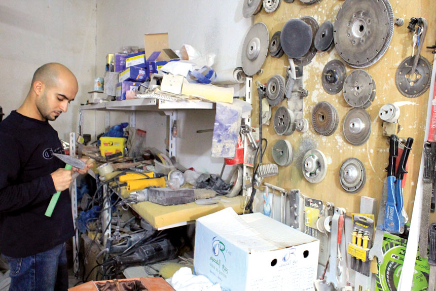 الطخيس نحاتٌ منظم، يحب أن يضع كل شيءٍ في مكانه الخاص. أدواته مرتبة بعناية، وشديدة النظافة. فهو يحرص على تنظيفها بنفسه يومياً. هذا الترتيب اللافت جعلنا نسأله :هل كل النحاتين هكذا، أم أنك تعاني هوس النظافة والترتيب، فأجاب ضاحكاً: أنا ببساطة أتعامل مع أدواتي بشكلٍ إنساني، وهذه الأدوات هي التي أجبرتني على سلوك هذا النهج.