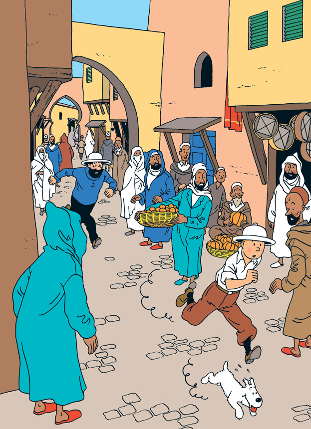 هيرجيه مؤلف مفتون بالمغامرة الغنية بالغرائب، وهو يبسط نظرته الاستشراقية على بلدان لم يزرها قط. الصورة التي يرسمها للعرب، مستمدّة من نظرته إلى العالم، وهي نظرة مطبوعة بالعصر الاستعماري الذي قام خلاله بكتابة المغامرات العربية الأربع لبطله تان تان. تسيطر على هذه الصورة نظرة ذات سمة استعمارية، تلطّفها نزعة إنسانية تجاه بعض شخصياته العربية.