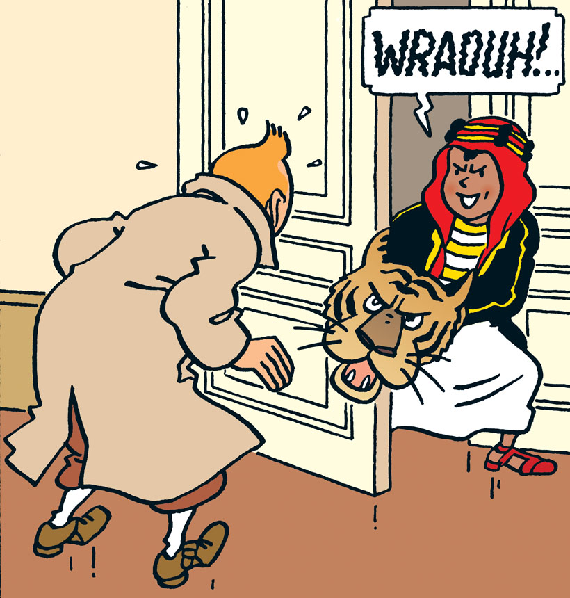 ويتيح مجلد «السلطعون ذو الكلابات الذهبية» لهيرجيه أن يثأر رمزياً من الغزاة، بواسطة الكابتن هادوك الذي يتمكن من دفع عصابة من المهاجمين إلى الفرار. وينبئ «تان تان في بلاد الذهب الأسود» بدور النفط في الشرق الأوسط. وفي سنة 1971م، طلب ناشر النسخة الإنجليزية لهذه المغامرة، وبسبب انحيازه إلى إسرائيل، أن يشطب هيرجيه أية إشارة إلى النزاع الإسرائيلي- العربي. وفي مجلد «فحم مخزّن» يلقي تان تان درساً في الأخلاق، بإفشاله صفقة تجارة عبيد في البحر الأحمر سنة 1956م. إنه لا يدرك أن زمن الاستعمار قد ولّى، ويبدي عدم اكتراث بالعالم العربي، حالماً يكف هذا العالم عن التجاوب مع معايير حلمه الشرقي. وتعاود بعض شخصيات هيرجيه العربية الظهور في أوروبا، في مجلد «تان تان وفن الأبجدية»، المجلد الأخير في السلسلة، وهو بحث غامض عن الهوية، ظل غير مكتمل حتى وفاة هيرجيه سنة 1983م.