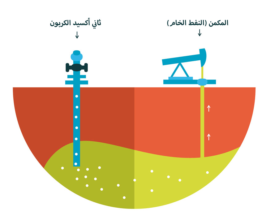 من جهة أخرى، قد يلجأ الخبراء في مجال استخراج النفط إلى استخدام غاز ثاني أكسيد الكربون في آبار النفط من أجل استعادة الضغط في داخل الحوض، حيث يضخ هذا الغاز بضغط عالٍ جداً، ويتم الحصول عليه من محطات توليد الطاقة الكهربائية أو من محطات معالجة الغاز الطبيعي، وهذه الطريقة متبعة على نطاق واسع في الولايات المتحدة الأمريكية. وبالإضافة إلى فائدتها في تعزيز الضغط الداخلي في البئر، فإنها أيضاً تساعد على التخلص من غاز ثاني أكسيد الكربون الملوث للبيئة والمتهم الرئيس بظاهرة الاحتباس الحراري.