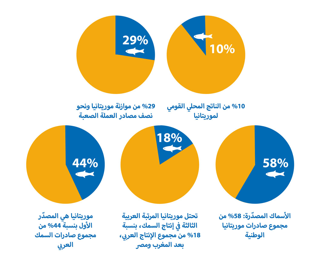 وتستحوذ الأسماك المصدّرة على %58 من مجموع صادرات موريتانيا الوطنية، و%10 من الناتج المحلي القومي، و%29 من موازنة الدولة، ونحو نصف مصادر العملة الصعبة. ومع أن موريتانيا تحتل المرتبة العربية الثالثة في إنتاج السمك، بنسبة %18 من مجموع الإنتاج العربي، بعد المغرب ومصر، إلا أنها المصدّر الأول، بنسبة %44 من مجموع صادرات السمك العربي. فاستهلاك المواطن الموريتاني من السمك في طعامه قليل، إذا قورن بمكانة البلاد الإنتاجية، ذلك أن لحم المواشي الأحمر هو مصدر البروتين الأول على الموائد الموريتانية.