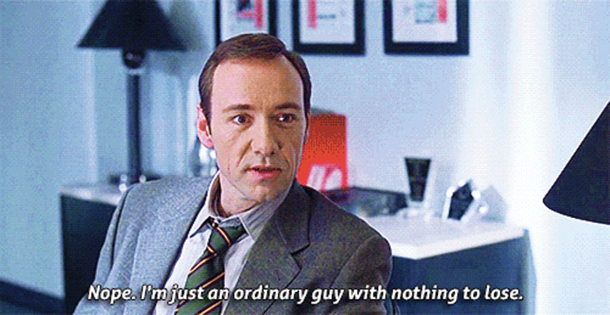 • «أنا لست سوى إنسان عادي ليس لديه ما يخسر». (كيفن سبيسي في فِلم «جمال أمريكي»، اخراج سام مينديس، سيناريو الآن بال – 1999م).