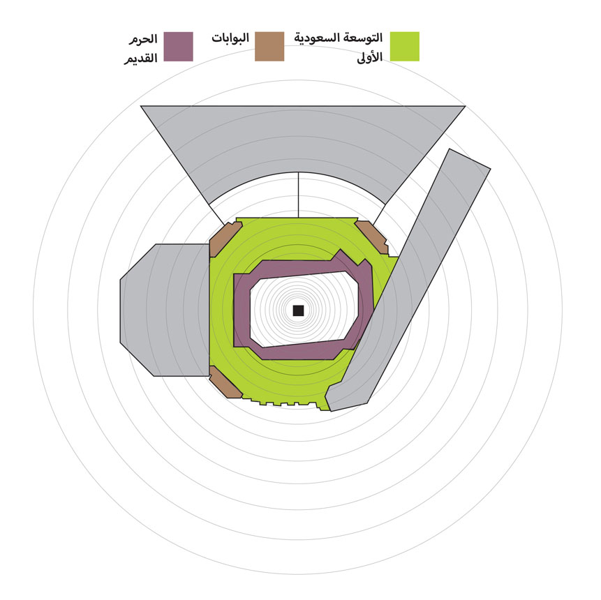 تجدر الإشارة إلى أن التوسعة الأولى للحرم المكي الشريف قد مرت بأربع مراحل متتالية، كانت الأولى بين عامي 1375 و1381هـ، وشملت بناء المسعى بطابقيه، بعرض 20 متراً وارتفاع 12 متراً للطابق الأول، و9 أمتار للطابق الثاني. وجعل للطابق الأول من المسعى ثمانية أبواب على الواجهة الشرقية للشارع العام للدخول منها إلى المسجد الحرام، وجعل للطبقة الثانية منه مدخلان من خارج الحرم، أحدهما عند الصفا، والآخر عند المروة، كما جعل لهما مصعدان، أحدهما عند باب السلام والآخر عند باب الصفا.