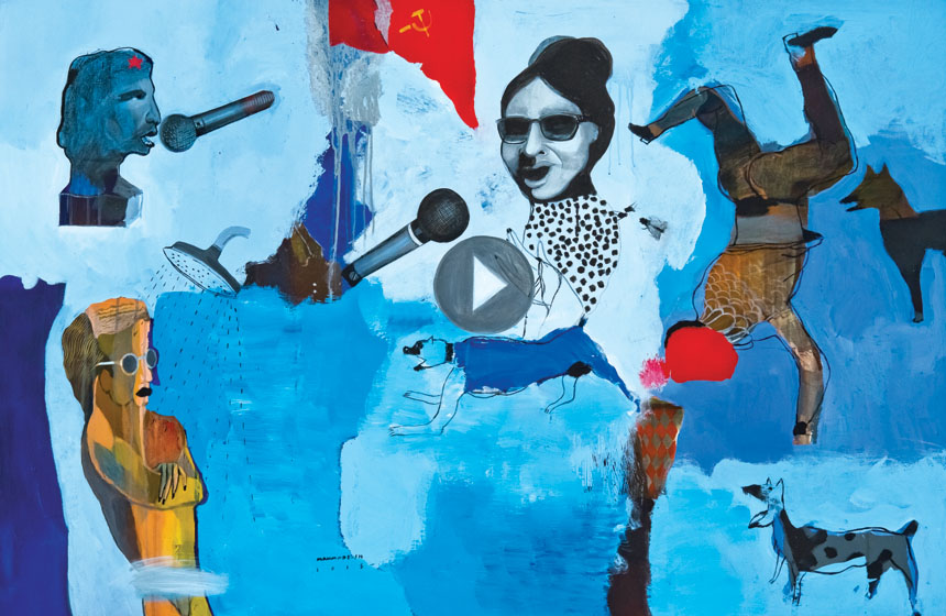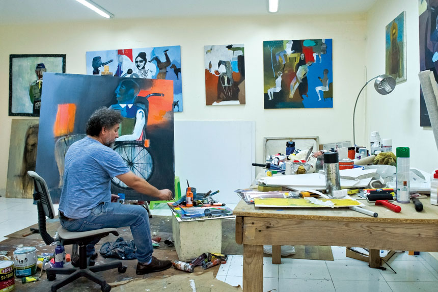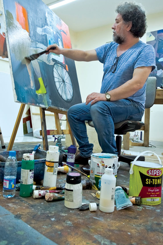 سألناه: ما كل هذه الفوضى؟ أجاب: «هكذا أرسم وبهذه الفوضى أجدني أنغمس أكثر في لوحتي. أحب الترتيب والنظام ولكن ليس حينما أبدأ بالرسم. لا أحب المركزية في ترتيب الأشياء، أكره الحسابات والرياضيات. حتى عندما أرسم الخطوط في اللوحة فإني أرسمها بطريقة مائلة لا أعرف إذا كان هذا الأمر سلبياً أم إيجابياً.. أميل أحياناً إلى ترتيب أشيائي وحين أرتبها أشعر بالضياع. هذه الفوضى التي ترينها هي جزء من كينونة العمل وصيرورة الأشياء، والتي من خلالها أستطيع التواصل مع لوحتي. أتعامل مع اللوحة بعاطفة، والفوضى تمنحني هذه الخصوصية».