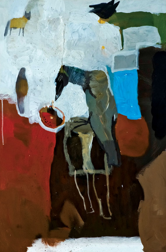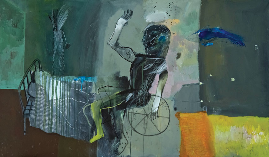 Mahmoud Shubar  176وعلى الرغم من المساحة الكبيرة لمحترف شُبّر، إلا أنه اكتفى بشغل زاوية منه احتضنت كل جنون فنه، بينما كان لبعض أعماله نصيبٌ من بقية المكان. فبعضها اتكأ على جدرانها والآخر ينتظر إلى أي فضاء سينتقل. لكن الأمر لم يخلُ من زاوية بسيطة خاصة، وفيها من الحميمية كثير على الرغم من بساطتها المفرطة. وبمجرد النظر لها يمكنك معرفة أين يستريح هذا الفنان البابلي. لا شيء، سوى كرسيين لا يشبهان بعضهما، وطاولة صغيرة كانت المنفضة أول ما تراه فيها. ولم نعرف السبب الذي جعله يغطي نصف النوافذ بأوراق تشبه أوراق الصحف إلا حين أخبرنا أنه أصرَّ على عدم حجب الضوء تماماً عن المكان فغطى نصفها ليحظى بقليل من الخصوصية التي تعزله عن فضول المارة. ويعزو ذلك كما أسلفنا إلى علاقته بالضوء وارتباط مزاجه أثناء الرسم بوجوده، على الرغم من أنه لا يتوقف عن الرسم حتى حين يحلُّ الظلام.