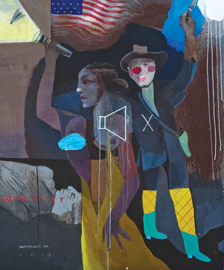 Mahmoud Shubar  107هذا ما نقرأه في لوحة «المهرج» وغيرها من الأعمال التي صور فيها بعض القيادات التي توالت على العراق بالمهرجين. وأيضاً في لوحة «البسطار»، أي الحذاء العسكري. وهنا يظهر اشتغاله على ثيمة الحرب، فهو من أوائل الفنانين الذين عملوا عليها بكل تفاصيلها. حتى إن عناوين معارضه تشمل الجانب السردي الذي نراه في الأختام البابلية والجداريات التي تروي كثيراً من قصص المدينة. فلوحته شاشة سينمائية يضمنها لهذه التفاصيل التي من شأنها ملء مخيلة المتلقي بالأفكار التي يريد إيصالها له.