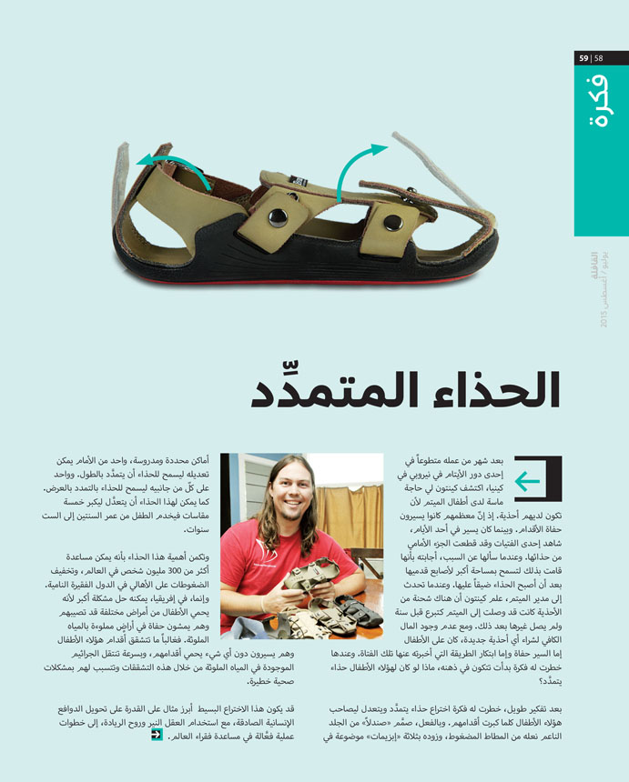 ومن مصر، عقَّب رمضان إبراهيم بشير على ما جاء في باب «فكرة» في عدد يوليو أغسطس 2015، حول الحذاء المتمدِّد، ورأى أنها فكرة إبداعية بالفعل، وإنسانية في الوقت نفسه، متمنياً على رجال الأعمال تبني هذا الاختراع وتصنيعه لما فيه من فائدة، خصوصاً للفقراء.