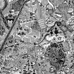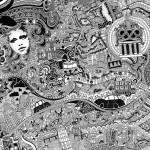 إنها خارطة معقَّدة ومتداخلة، مملوءة بالرموز الخفية والتفاصيل التاريخية والذكريات الخاصة. فهناك علامة استفهام مكان عقارب ساعة «بيغ بن» الشهيرة وكأنه يتعجب بأن حتى ساعة «بيغ بن» لا تعرف الوقت الحقيقي في هذا الزمن المعقد. وهناك رسومات لوجوه ارتبطت في ذاكرته بأماكن معيَّنة ولكنها غابت عن هذه الدنيا. وهناك النوتات الموسيقية المتصاعدة من المسارح والمقاهي التي تُضفي على المدينة حيويتها ونبضها الخاص هذا، بالإضافة إلى الأوراق النقدية التي تطايرت من مبنى جيركين في الحي المالي للمدينة. وإذا نظرنا بدقة نرى المتشردين الذين ينامون تحت الجسور في شورديتش شرقي لندن، وغيرها الكثير من التفاصيل التي تعكس فوضى المدينة الساحرة.