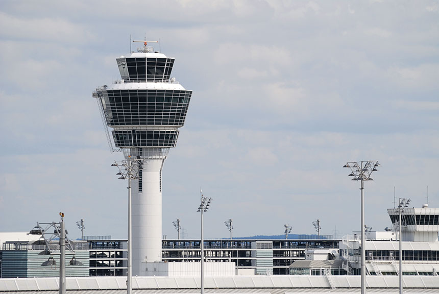 يناسب موقع وشكل غرفة التحكم بالحركة الجوية المتمركزة في برج المطار، القيام بالعمليات الأمنية في المطار والإشراف على مهام الرصد. كما أنّها صمّمت بتأنِّ وزوّدت بكامل أساليب الراحة وأحدث وسائل التكنولوجيا تطوّراً، لكي توفِّر جوّاً من اليقظة خالياً من التوتّر والإجهاد للمراقبين العاملين داخلها، إذ تقع على عاتقهم مهمّة الحفاظ على سلامة أعداد كبيرة من الأرواح.