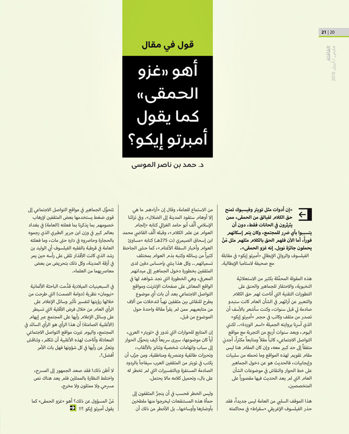 بعدما قرأت بدقة مقالة الدكتور حمد بن ناصر الموسى «أهو غزو الحمقى كما يقول أمبرتو إيكو؟» المنشورة في عدد مارس / أبريل 2016م، لم يكن بإمكاني إلا أن أثني على كل حرف ورد فيها، وأن أجيب عن السؤال المطروح في العنوان: «نعم، إنه بالفعل غزو الحمقى».