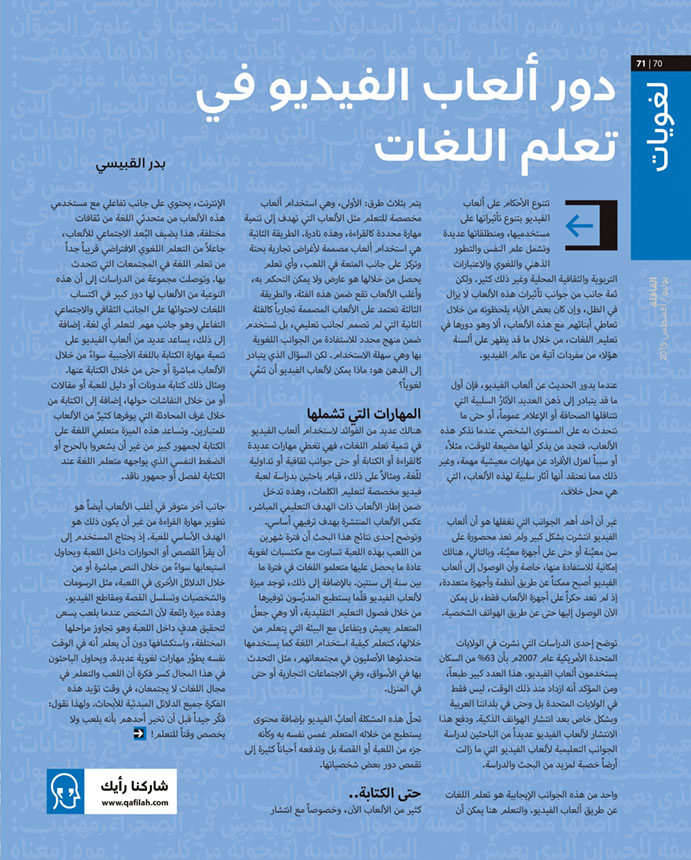 تعقيباً على مقال «دور ألعاب الفيديو في تعلُّم اللغات» المنشور في زاوية «لغويات» في عدد القافلة 4. مجلد 64. يوليو/ أغسطس 2015م.