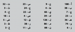 في هذا الجدول أدناه، ترتيب الحروف التقليدي، (أبجد هوّز)، وبقرب كل حرف عدد مرات ترداده في النص القرآني المذكور:ويتبيّن من إحصاء الحروف أن حرف الألف تكرر هنا 188 مرة، فيما تكرَّر حرف اللام 126 مرة، وهما الحرفان الأبجديان اللذان يتصدّران بلا منازع ترتيب الحروف في اللغة العربية، من حيث كثرة تردادهما. وهذا منطقي، ذلك أن أل التعريف كثيرة الورود في النص العربي، كما أن الألف قد تكون همزة أَ، أو ألفاً ا، أو ألفاً مقصورة ى. ولذا فهي متنوعة الكتابة، كثيرة الترداد.في أحرف الصف الثاني من حيث الترداد، النون (88) والميم (86) والواو (74) والياء (66). ثم في الصف الثالث، أحرف الكاف (39) والراء (38) والباء (38) والهاء (36) والتاء (32)… وهكذا، إلى أن نصل إلى الأحرف الأقل تردداً في اللغة العربية، وهي الضاد (5) والصاد (4) والطاء (4) والظاء (3) والثاء (3) والغين (3).