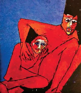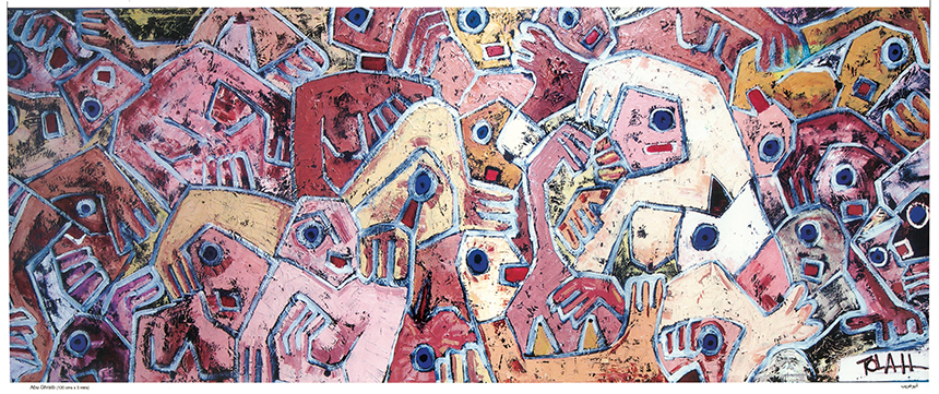 وما يلفت النظر في أعماله تلك المعالجة الجريئة للخطوط الحادة والخطوط الانسيابية والمنحنية، بحيث تساعد عين المشاهد على التركيز، كما تعطيه علامات ونقاط استدلال من خلال رموز وشخوص محاطة بأطواق.