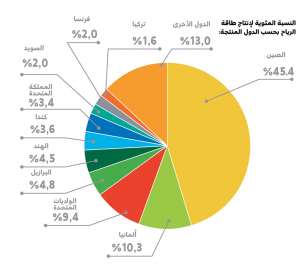 ففي العالم اليوم نحو 200 ألف توربينة كهرباء، بلغ إنتاجها في آخر عام 2015م نحو 432 جيغاواط. وبلغ إنتاج الاتحاد الأوروبي وحده في سبتمبر 2012م أكثر من 100 جيغاواط. وفي الأرقام الأمريكية أن الطاقة المولَّدة بالرياح في الولايات المتحدة خلال السنوات العشر الماضية، ازدادت سنوياً بنسبة %30، وهي أكبر مصدر للطاقة المتجددة اليوم (أكبر من الطاقة الشمسية والتيارات البحرية، وغيرها). وحتى العام 2010م كانت الولايات المتحدة تحتل المرتبة الأولى في العالم بإنتاج الكهرباء من طاقة الرياح. لكن الصين، العاملة بسرعة في اعتماد الطاقة المتجدّدة تخطتها.