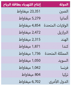 وفيما يلي ترتيب الدول العشر الأُو َلْ في العالم، إنتاجاً لكهرباء طاقة الرياح، في أرقام العام 2014: