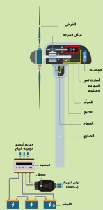 أما الباقي فيشبه تماماً تقريباً ما يحدث في السدود المولّدة للكهرباء، ذلك أن دوران أنصال المراوح، أكانت في مواجهة المياه أم الرياح، يدير محوراً يدير بدوره توربينات تولّد الكهرباء، بتحويل حركة الدوران إلى طاقة. وخلاصة القول هي أن توليد الكهرباء من حركة الرياح، ليس سوى نقل الطاقة الحركية، من حالة إلى حالة أخرى من الطاقة.