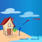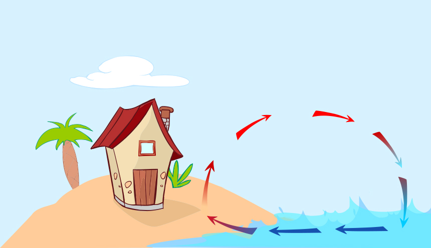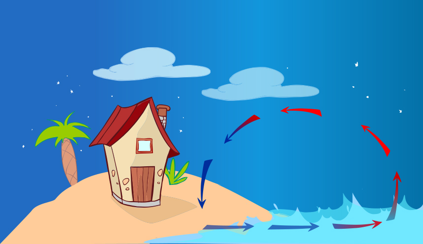 وبتطبيق هذه الحقائق العلمية على الطبيعة، نرى أنه حين تُشرق الشمس على بلد ما، له شواطئ بحر أو محيط، تأخذ المياه والشطآن في خزن الحرارة الشمسية، أي تبـدأ حرارتها في الارتفاع. لكن الشاطئ، الرملي أو الصخري يسخن بسرعة، لحاجته إلى كمية أقل من السُعرات. أما مياه البحر، فتسخن ببطء، وتظل باردة نسبياً، حين يأخذ الشاطئ في خزن السخونة.